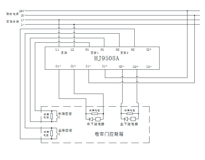 接线说明: L1、L2为总线; H1、H1:反馈一输入端子; H2、H2:反馈二输入端子; O1+、O1-:动作一输出端子; I1+、I1-:动作一DC24V输入端子, I1+接+24V,I1-接0V; O2+、O2-:动作二输出端子; I2+、I2-:动作二DC24V输入端子,IN2+接+24V,IN2-接0V。