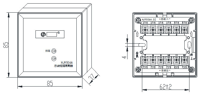 接线说明: +总线入-:二总线输入端(有极性) +总线出-:二总线输出端(有极性)